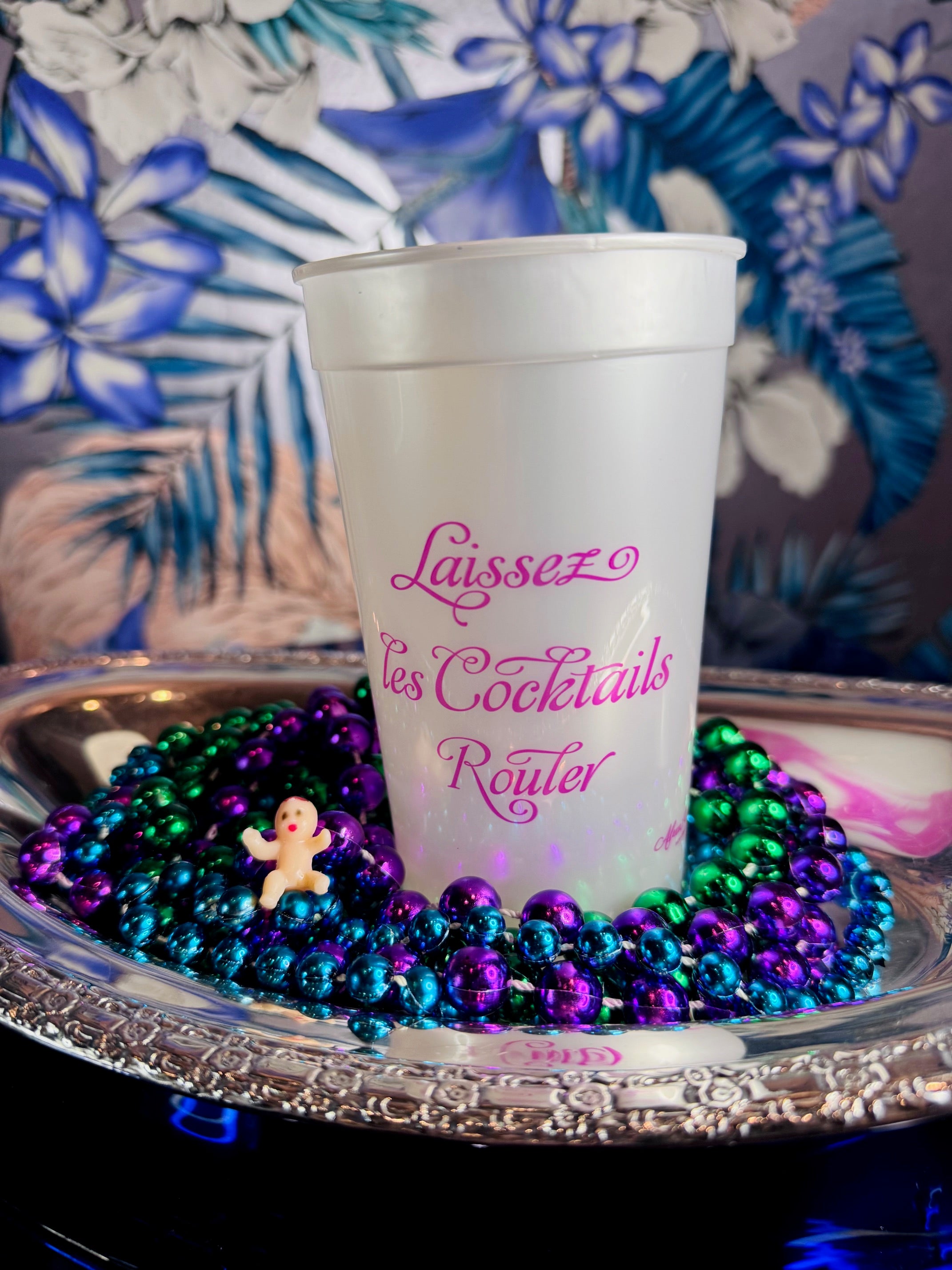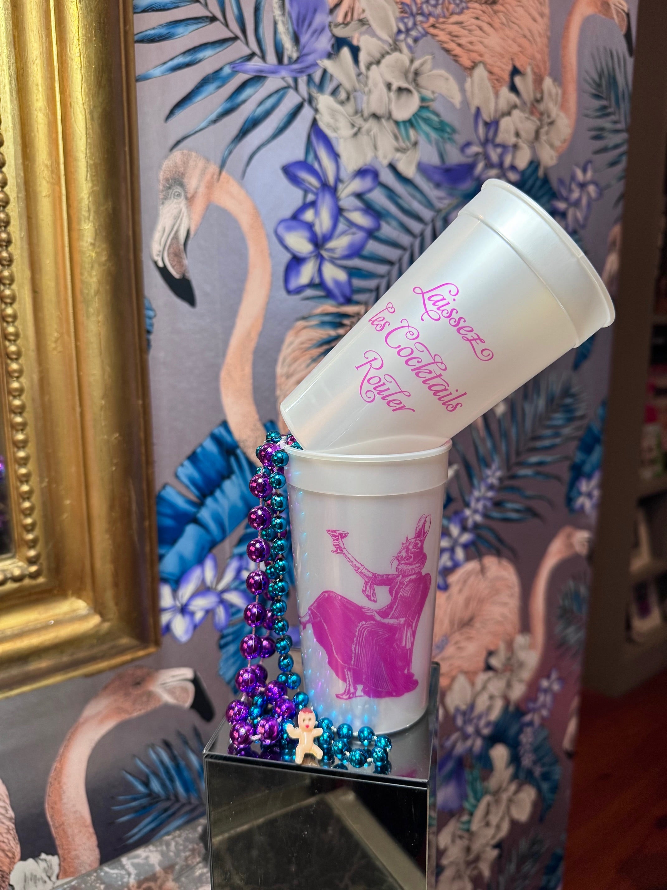 Let the Cocktails Roll! These luxe pearlized cups in collaboration with Alexa Pulitzer embody the spirt of the magical Mardi Gras season—with a mantra that lasts all year. Alexa's Party Bunny is printed on the opposite side in hot pink. The Go Cup of our dreams!